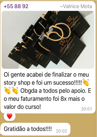 Você receberá o acesso a um grupo do WhatsApp com outras alunas do curso, para que vocês troquem informações e experiências. Sempre rola muuuita troca por lá...Esse grupo vale ouro!